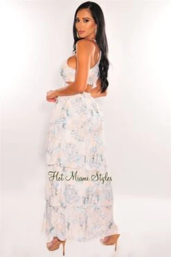 Take it easy poolside in this off shoulder bikini. Featuring a lace floral print, O-ring details and matching scrunch butt bottoms.