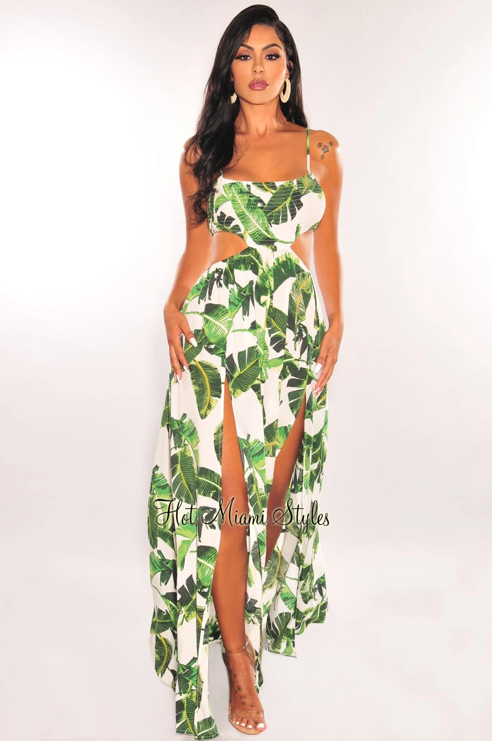 Feel like a goddess every step you take in this white palm print cut out maxi dress. Designed with a smocked bust and sexy double thigh high slits. Perfect for your getaway.