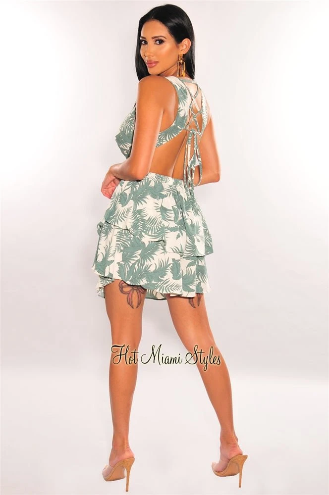 Staycay or vacay? This flirty cut out dress is everything you need. Features an O-ring detail on a plunge v neckline with a lace up open back on a fun print mini dress.