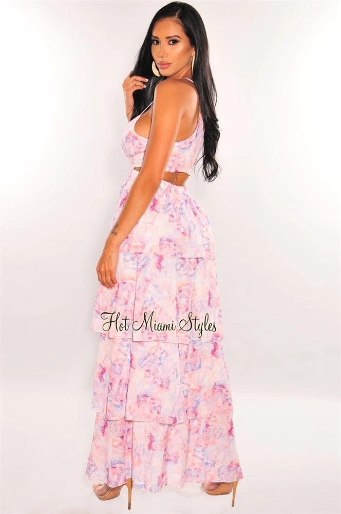 White Pink Print Spaghetti Straps Cut Out Layered Maxi Dress