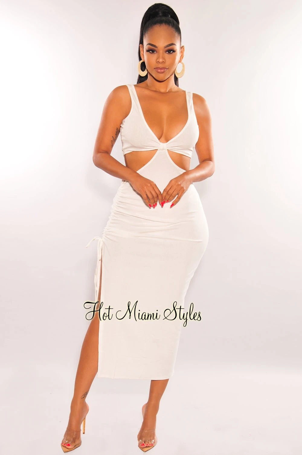 This white ribbed dress is our fave outfit goals. Features a chic knotted detail with an appealing cut out with a sexy side ruched slit dress.