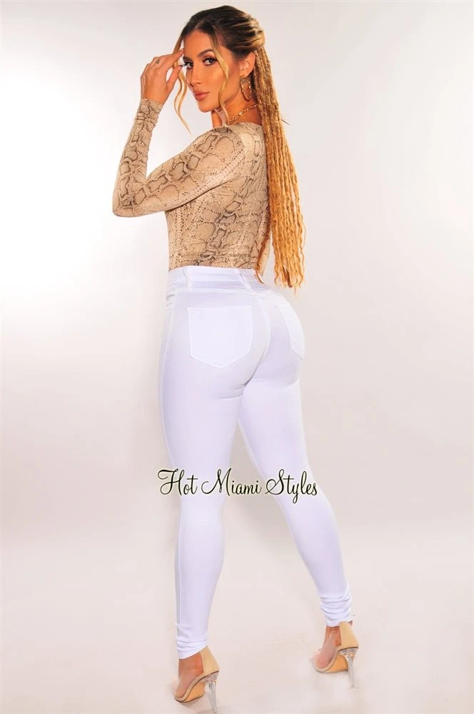 These pair of white skinny jeans are a must-have! These fitted jeans fit like second skin and feature a high waist and ripped knee detail.