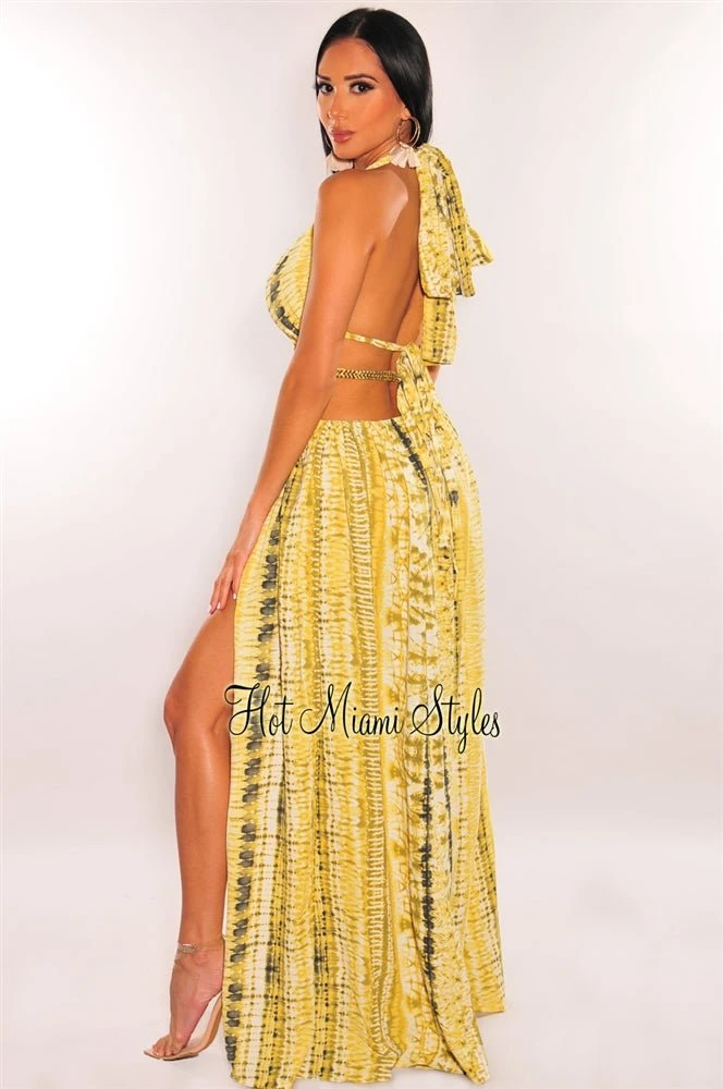 Leave them speechless in our beautiful maxi dress. Designed with a fun print on a halter neckline with a tie up gold detailed belt and sexy thigh high double slits.